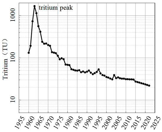 where Cp(t) represents the tritium concentration in precipitation, changing with the year; the constant term b represents the mean of the regression fitting data; cp(t,1) and cp(t,2) are common factors; and the constant terms f1 and f2 are common factor regression coefficients. The constant term ε is the standard error. In this research, the common factor scores and the constant terms of global representative sites from 1960 to 2014 were used by year [26,27], and the constant terms of the study area were obtained via the Hof-Hohensaas site and Ottawa (Ontario) site according to the linear correlation interpolation of the latitude. Thus, the tritium content of atmospheric precipitation from 1960 to 2014 was restored. Then, the correlation analysis was performed with the Ottawa (Ontario) data from the same period, and the tritium content of atmospheric precipitation from 2015 to 2022 was obtained according to the extension of the correlation equation. The tritium content of atmospheric precipitation in the Hulun Lake basin from 1960 to 2022 (Figure 2) was obtained from the International Atomic Energy Agency (IAEA).