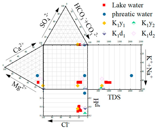 The K1y1, K1y2 and K1d1 Cretaceous confined aquifers with shallow roof burial depths have similar data drop points in the Durov analysis, and their average content of major cations K+ + Na+ is about 207.12 mg/L, while their mean proportion of major cations is about 95%. The K1d2 confined aquifer, with the deepest roof burial depth (441 m), shows a great difference in its hydrochemical characteristics from the other Cretaceous confined aquifers. The content of major cations K++ Na+ in the K1d2 confined aquifer is 160.04 mg/L, and its proportion of major cations is 72%. The average content of major cations in the lake water and phreatic water is 264.88 mg/L and 262.70 mg/L, respectively, and their proportions of major cations are 78% and 61%, respectively. The content and proportion of major cations in K1d2 confined water are closer to those in lake water and phreatic water.