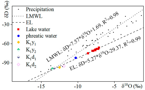 The δD and δ18O content of groundwater is lower than that in lake water, the overall performance is in the order of “confined water<phreatic water< lake water”, and the δD and δ18O values of phreatic water are −82.00‰ and −10.30‰. The phreatic data’s landing point is located at the EL, indicating that there is a strong interaction between the phreatic water and lake water, which causes the spatial distribution of the stable isotope composition [38]. The δD and δ18O values of the four Cretaceous confined waters have little difference, and the coefficient of variation is 1.52% and 4.87%, respectively; the δD value ranges from −99.00‰ to −95.00‰, with a mean value of −97.25‰; and the δ18O value ranges from −13.50‰ to −11.90‰, with an average value of −12.78‰. The δD and δ18O values of the K1d2 confined water with the deepest roof burial depth (441 m) are −95.00‰ and −11.90‰, which are higher than those in the K1y1, K1y2 and K1d1 confined aquifers. The stable isotope values of δD and δ18O in K1d2 confined water are closest to the lake water and the phreatic water in the same region.