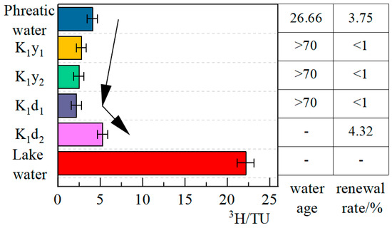 The δ3H values of the K1y1, K1y2 and K1d1 confined aquifers are between 0.22 TU and 4.00 TU, indicating that the confined water is a mixture of modern and premodern water. As the burial depth of the confined aquifer roof increases, the δ3H concentration of the water decreases, and the recharge and renewal capacity of the confined aquifer gradually weakens with the increase in the aquifer roof burial depth, indicating that the older the formation period of the confined aquifer, the worse the water recharge and discharge conditions and the lower the water renewal capacity. The water renewal rate determined by the PFM model indicates that the water renewal capacity of the K1y1, K1y2 and K1d1 confined waters is less than 1%. The δ3H concentration of the K1d2 confined aquifer is 5.30 TU, which is far higher than the δ3H concentration of other Cretaceous strata confined aquifers. The water renewal rate is 4.32%, showing a large difference from other Cretaceous confined aquifers, indicating that the discharge condition of the K1d2 aquifer is poor and is affected by external water sources. Combined with the unique topography of the lake, the hydraulic exchange between the groundwater and phreatic water or lake water in the confined aquifer was analyzed through the tectonic fracture zone.
