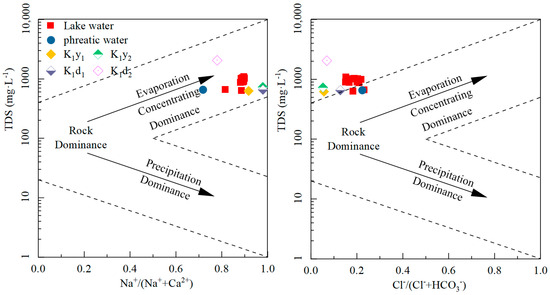 The main influencing factors of water chemical evolution can be determined by the analysis of ion end-elements and the main ion relationships (Figure 7). The effects of dilution and evaporation on hydrochemistry can be measured by the ratio of Mg2+/Na+ to Ca2+/Na+. The main sources of ions in water can be divided into carbonate (i.e., calcite and dolomite) rocks, the chemical weathering of silicates (i.e., feldspar, Ca-plagioclase, and olivine) and evaporative dissolution (i.e., halite, gypsum) [42]. As can be seen from Figure 7a, silicate rock and evaporite are the main factors affecting the evolution of the water chemical composition in the lake water and groundwater, and the confined water is more strongly affected by evaporation dissolution than phreatic water. The Na+/Cl− ratio is often used to explain the dissolution of evaporite. It can be seen from Figure 7b that the ratio of Na+/Cl− in both lake water and groundwater is greater than 1, indicating that Cl− and Na+ are not entirely derived from rock salt dissolution. Other sodium-bearing minerals are also dissolved in the water in addition to rock salt, such as aluminosilicates. In addition, the Ca2+ in groundwater can also be exchanged with the Na+ in soil, making the water concentration of Na+ higher than that of Cl−.