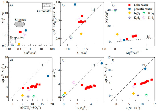 Ratios of major ions in various water bodies: (a) Mg2+/Na+ to Ca2+/Na+, (b) (Ca2++Mg2+)/(Na++K+) to Cl−/Na+, (c) Na+/Ca2+ to Mg2+/Ca+, (d) n(Ca2++Mg2+) to n(HCO3−+ SO42−), (e) n(Ca2+) to n(Mg2+), (f) n(Ca2++Mg2+) to n(Na++K+).