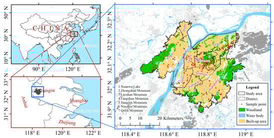 The study area considered in this paper is the Nanjing megapolis (118°27′ E, 31°48′ N–119°4′ E, 32°17′ N, Figure 1), which has an area of 1127.78 km2. The terrain of this area is relatively flat and mainly composed of low mountains, hills, and plains, and it has a subtropical monsoon climate with four distinct seasons. The main vegetation is evergreen and deciduous broad-leaved forest, which is suitable for supporting a variety of bird habitats. Simultaneously, this area is a megapolis in the Yangtze Delta urban agglomeration with a developed economy, a large population [39], and an urbanization rate of more than 86% [40]. The unique coexistence of high bird diversity and a high urban rate in this area provides an ideal research area for exploring solutions to the harmonious coexistence of birds and humans.