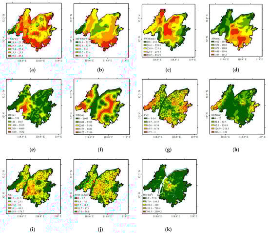 The meteorological data were obtained from the 1 km resolution monthly mean temperature, maximum temperature, minimum temperature, and precipitation dataset (1901–2022) of the Institute of Tibetan Plateau Research [41,42]. Based on the monthly mean, maximum, and minimum temperatures, as well as precipitation data from the Nanjing urban area spanning 1991 to 2020, various climate indices were calculated; the vegetation coverage index was obtained from the MODIS data product (MOD13Q1), and the average value of the Eco-environment Vulnerability Index (EVI) for the Nanjing megapolis in 2020 was extracted with a spatial resolution of 250 m; the night light index was from 2020. The night-light remote sensing image of the NPP-VIIRS (Visible Infrared Imaging Radiometer) was taken in 2014 with a spatial resolution of approximately 500 m; the altitude of the Nanjing megapolis was obtained from the STRM (Shuttle Radar Topography Mission) elevation data, which were compiled by NASA and the National Imagery and Mapping Agency (NIMA). The spatial resolution of the data was 90 m, and the topographic relief was calculated based on altitude data. The population density data were obtained from WorldPop population data (www.worldpop.org, (accessed on 29 September 2023)) with a resolution of 100 m. The density was obtained from the 2020 Baidu map road data, and ArcGIS 10.2 software was used to calculate the road density. The water and forest data were obtained from the 30 m global land-cover data GlobeLand30 2020. These data are global land-cover data developed in China, and they have a 30 m spatial resolution. The water and forest data in the Nanjing megapolis were extracted, and the distances to the waters and forests were calculated using ArcGIS 10.2 software. The above data were uniformly resampled to a resolution of 100 m.