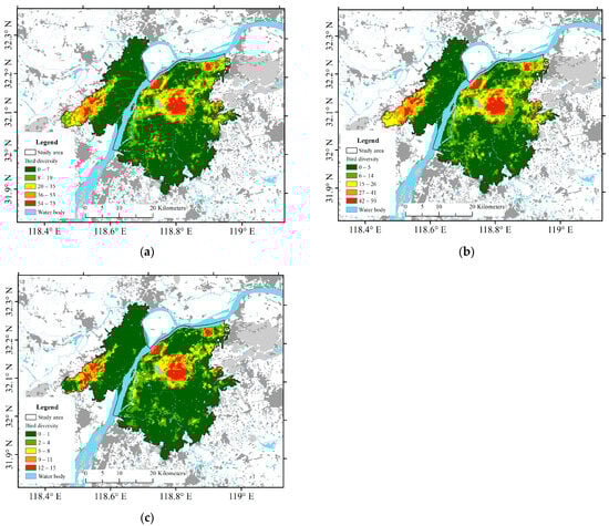 (a) Distribution map of all bird diversity in the Nanjing urban area; (b) distribution map of migrant diversity in the Nanjing megapolis; (c) distribution map of resident diversity in the Nanjing megapolis.
