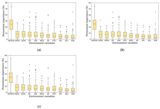 (a) Permutation importance of each environmental variable for all birds; (b) permutation importance of each environmental variable for migrants; (c) permutation importance of each environmental variable for residents.