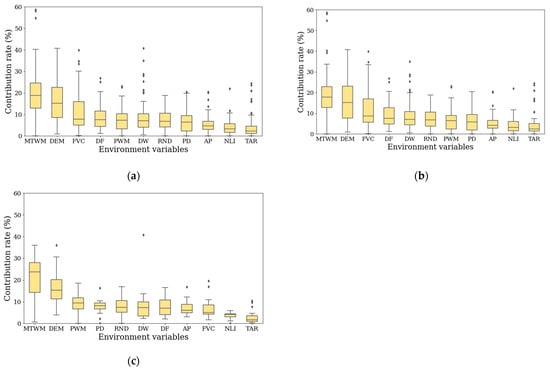 In this paper, the contribution degree and permutation importance index in the MaxEnt model were used to comprehensively evaluate the importance of environmental variables. The contribution degree focused on quantifying the specific impact of each environmental variable on the model prediction results and determined the features in the model that are the key factors dominating the prediction results, while the permutation importance determined the environmental variables that were critical to maintaining the model’s performance [56].