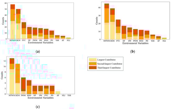 (a) Counts of environmental variables ranked in the top three for contribution rate across all birds; (b) counts of environmental variables ranked in the top three for contribution rate across migrants; (c) counts of environmental variables ranked in the top three for contribution rate across residents.