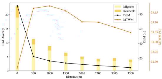 MTWM, PWM, and DF were negatively correlated with bird diversity, indicating that the temperature of the warmest month was lower, the precipitation of the warmest month was lower, and the areas close to forests had higher bird diversity. FVC and DEM were positively correlated with bird diversity, indicating that bird diversity is high in areas with high vegetation coverage and high altitude. Among them, the correlation coefficient between MTWM and bird diversity had the largest absolute value (Table 3). The environmental variables all passed the significance test at the 0.01 level [60]. The negative effects of MTWM, PWM, and DF on bird diversity and the positive effects of FVC and DEM on bird diversity are credible and consistent with the current study [61,62,63].
