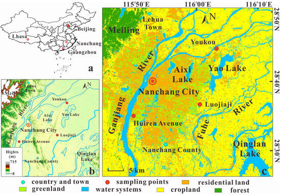 Nanchang City (E115°27′ to 116°35′, N28°10′ to 29°11′) is located between Ganjiang River and Fuhe River in the middle–lower reaches of the Yangtze River in South China, adjacent to the largest freshwater lake, Poyang Lake, in China (Figure 1). The city has a total area of about 7000 km2 with a total population of about 5.3 million. Low mountains and hills, eroded hills, and plain landforms are developed from northwest to southeast of the region. The low mountains and hills are mainly distributed in the Meiling area in the northwest, with an elevation of 300~500 m, lithologically composed of granite and gneiss. The weathered denudation mound is located in Lehua Town in the northwest, with an elevation of 30~70 m, and mainly consists of eluvial red loam and upper Cretaceous purplish red sandstone. The alluvial plain is distributed in a vast area east of the Ganjiang River, consisting of sand and gravel layers formed during the Holocene, Middle Pleistocene, and Upper Pleistocene alluvial deposits. Above the layers, silty loam is developed, with a thickness of 5~10 m. The land of Nanchang City is mainly used for cultivation and forests. With the intensification of urbanization, the construction of land has gradually expanded [31]. A subtropical humid monsoon climate prevails in Nanchang, which is humid and mild. The average annual rainfall is 1645 mm/a [32], with the rainy season from April to June accounting for 51.3% of the annual precipitation. The dry season is from November to January, with precipitation accounting for 9.6% of the whole year. The historical average annual temperature ranges from 17.1 °C to 17.8 °C, with a historical maximum temperature of 40.9 °C and a historical minimum temperature of −15.2 °C. The average annual evaporation is 934.4 mm/a, mainly occurring in summer and autumn. The wind tends to be northerly in winter but southerly in summer.