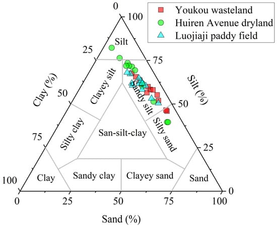 The median grain size of the soil profile in the Youkou wasteland varied between 10.1 and 19.8 μm, with an average value of 14.3 μm (Table 1). The silt content in this profile was the highest, with an average value of 57.1%, followed by sand content (34.9%), and clay content was the lowest (Table 1). The median grain size of the soil profile in the Luojiaji paddy field varied between 9.58 and 16.9 μm, which was lower with slightly higher silt and clay contents and lower sand content than that in the Youkou wasteland (Table 1). The average median grain size of the dryland soil profile in Huiren Avenue was 11.8 μm, which was close to that of the soil profile in the Luojiaji paddy field (Table 1). The average content of silt in this profile reached 63.9%, which was the highest among the three profiles; the clay content varied between 6.72% and 13.6%, with an average of 9.7%, and the sand content varied between 4.14% and 52.8%, with an average of 25.8% (Table 1). Overall, the three soil profile samples had similar grain size compositions (i.e., the highest content for silt and the lowest for clay), with the vast majority located in sandy silt areas (Figure 2). The contents of clay and silt gradually decreased from top to bottom in the upper 0~120 cm of the soil profile in the Youkou wasteland and increased gradually in the lower 120~240 cm, while the sand content had the opposite trend (Figure 3). The contents of clay and silt in the soil profile of the Luojiaji paddy field gradually increased from top to bottom, while the sand content showed an opposite change (Figure 3). The contents of clay and silt increased with depth in the upper 0~120 cm of the dryland soil profile in Huiren Avenue but decreased below 120 cm, while the sand content varied inversely (Figure 3). In the three profiles, clay was positively correlated with silt but negatively with sand, reflecting the similar distribution states of grain size compositions in different profiles (Table 2).