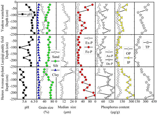 The pH value was negatively correlated with various phosphorus forms, silt, and clay, but it was positively correlated with sand and median grain size in the Youkou wasteland soil profile (Table 2). The pH value was positively correlated with OP, but it was negatively correlated with Au-P and had weak correlations with other variables in the soil profile of the Luojiaji paddy field (Table 2). In the Huiren Avenue dryland soil profile, the pH value had positive correlations with Fe-P, De-P, IP, TP, and silt, while it was negatively correlated with sand and mean grain size (Table 2).