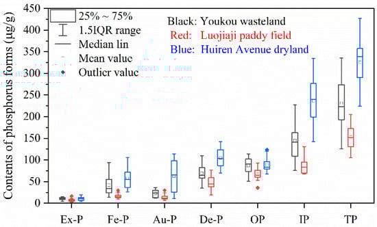 Box diagram showing phosphorus forms in soil profiles under three land use patterns in Nanchang City.