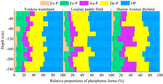 Overall, the contents of total phosphorus and various phosphorus forms were the highest in the Huiren Avenue dryland soil, higher in the Youkou wasteland soil, and the lowest in the Luojiaji paddy field (Figure 4). In addition, the proportions of various phosphorus forms were ranked as OP > De-P > Fe-P > Au-P > Ex-P in the Youkou wasteland soil and the Luojiaji paddy field soil, while they were ranked as De-P > OP > Au-P > Fe-P > Ex-P in the Huiren Avenue dryland soil (Figure 5). The results described above were mainly due to (1) the Huiren Avenue dryland soil being mainly used for sporadic vegetable planting with manure use, which led to the accumulation of soil phosphorus; (2) despite the use of fertilizers in the Luojiaji paddy fields, the discharge and leakage of paddy water, as well as the absorption and utilization of plants, could lead to the loss of phosphorus in the soil; (3) the Youkou wasteland soil was in a natural state without human activities, so the loss of phosphorus was mainly caused by precipitation runoff. Both OP and De-P accounted for the largest proportion among the three land use patterns of soils, reflecting the relative stability of these two forms of phosphorus.