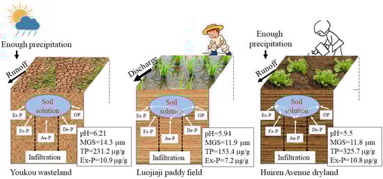 The relationships between the pH value and phosphorus forms were disturbed by surface erosion in the Youkou wasteland, by rice planting in the Luojiaji paddy field, and by vegetable cultivation in the Huiren Avenue dryland. Fe-P, De-P, and OP were mostly enriched in the fine-grained fractions of the Youkou wasteland, the relationships of grain sizes and phosphorus forms were affected by rice planting to some degree in the Luojiaji paddy field, and Fe-P and De-P were only enriched in silt and clay fractions in the Huiren Avenue dryland. Ex-P and other phosphorus were only transformed in the Youkou wasteland. There was a certain transformation between Au-P and OP in the Luojiaji paddy field, with a slight transformation of De-P into Ex-P. Ex-P only had a certain transformation with Fe-P and Au-P in the Huiren Avenue dryland with the transformation of Au-P to Ex-P and OP. This study found that rice planting and vegetable cultivation significantly disturbed the original behaviors of phosphorus forms in soils.
