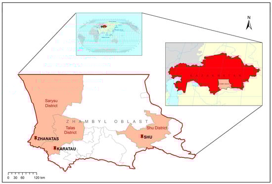 The studied cities of Karatau and Zhanatas, of the Zhambyl region located in the southern part of Kazakhstan, were taken as the research area (Figure 1). These cities are considered small single-industry towns, with economies based on a certain industry and small populations. Although the cities studied each have a small area, the region falls within the temperate desert zone, which is marked by low precipitation, high evaporation, and notable daily and annual temperature fluctuations. This leads to pronounced continentality, aridity, water scarcity, and adverse natural phenomena.