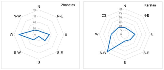 The city of Zhanatas is influenced by mountain–valley winds. Westerly, north-westerly, and south-westerly winds prevail here (54%); the average wind speed in this direction exceeds 4 m/s. According to the portal meteoblue.com [60], the yearly duration of south-westerly winds with a speed of over 17.2 m/s is 5 h, with a speed of over 11 m/s recorded for 73 h during the year (Figure 6).