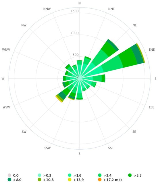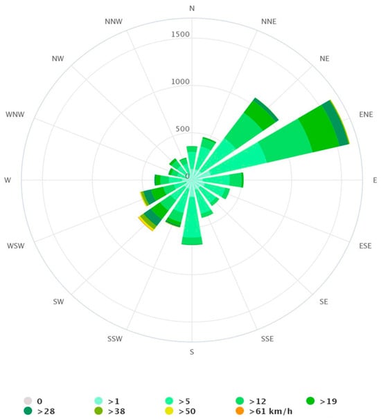 A model of wind speeds in Karatau was created using the portal meteoblue.com [60], using long-term data; it indicates how many hours per year the wind blows from a certain direction. The Karatau wind rose reflects the frequency and speed of the winds (Figure 5).