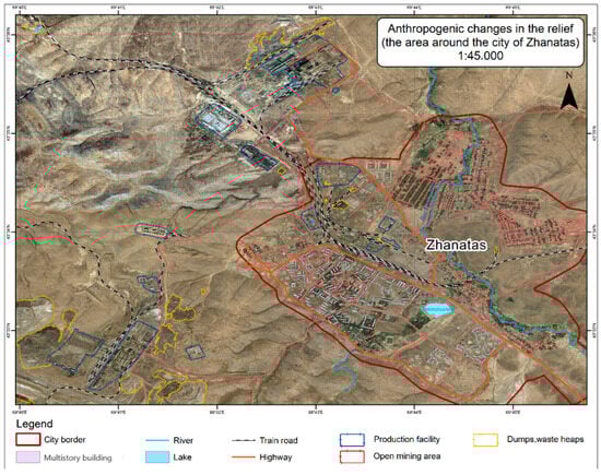 Mines and ore dumps in the west and southwest of Zhanatas.