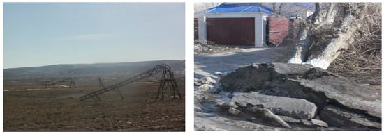 In recent years, the Zhambyl region has frequently experienced hazardous meteorological phenomena, such as strong winds, drought, and heat. Especially in the research area, the number of storm-level winds has increased. For example, the cities of Zhanatas and Karatau were severely affected by the hurricane wind that occurred on 2 January 2013 [61]. On that occasion, under the influence of a storm with wind speeds of 35–40 m/s, a 60-m pipe of the central boiler house collapsed in the city of Karatau, and power transmission poles fell and trees were uprooted (Figure 8).