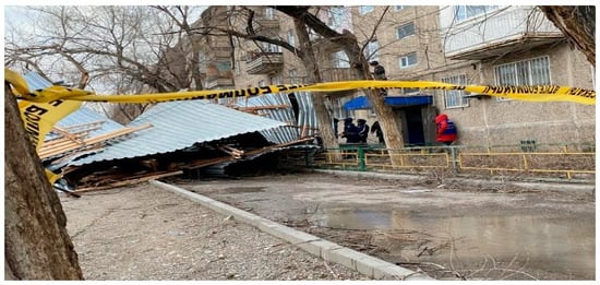 On 24 March 2015, 17–18 November 2021, and 3 January 2023, the hurricane conditions in the cities of Zhanatas and Karatau were repeated, tearing off the roofs of buildings in the cities of Zhanatas and Karatau, and damaging communication stations and power lines. At those times, a state of emergency was declared in these areas due to the natural disasters (Figure 9).