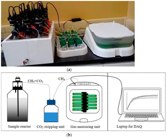 (a) The bioprocess reactor used for BMP tests (AMPTS II); (b) schematic diagram of AMPTS II system. (Adopted from Xia et al. [38]).