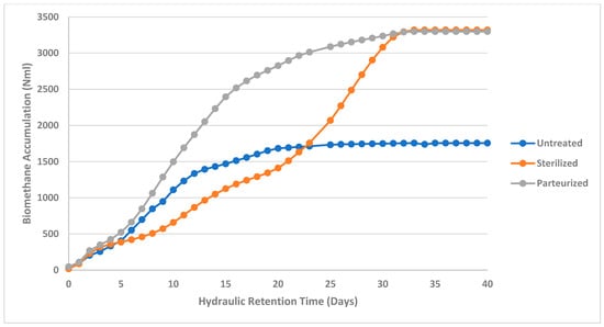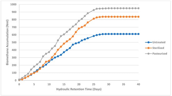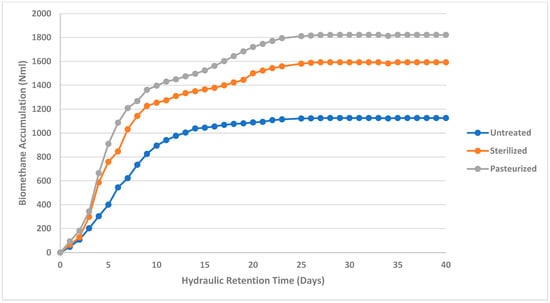 Biomethane accumulation of pig slaughter waste at a mesophilic temperature (37 °C) for untreated, sterilized, and pasteurized samples with an HRT of 40 days.