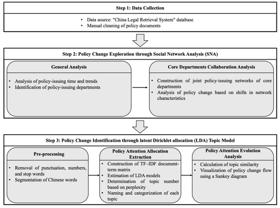 Policy texts subject to the business environment are selected as the data basis for analysis. All the policy texts are collected from the “China Legal Retrieval System” database (https://www.pkulaw.com/, accessed on 2 December 2023) using the search term “business environment” for precision. To ensure accuracy and streamline the analysis, only national-level policy texts are selected, considering the significant socio-economic variations among the provinces and cities in China. All policies were formulated by China’s central government, including the State Council and all relevant functional departments. The policy formats include regulations, decisions, announcements, opinions, and other normative forms of administrative documents. Each policy text undergoes manual verification. After excluding texts of low relevance and removing informal text forms such as letters and replies, 1335 pieces remain. The earliest policy in the dataset was issued on 21 June 2006, while the most recent one is dated 2 December 2023. The remaining policy texts reflect trends in national regulation within the business environment, thereby forming the foundation for subsequent quantitative analysis. The process of the research covers three main steps, including data collection, policy exploration through joint policy-issuing networks, and policy change identification using latent Dirichlet allocation topic model, as shown in Figure 1.