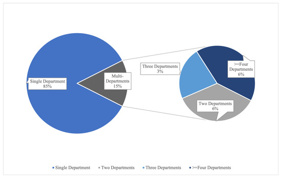 When policies address multiple targets, both the policy-setting and implementation phases become complex, necessitating collaboration among ministries with diverse functions. Since 2006, 1335 business environment policies have been issued. While 85.02% of these policies originate from a single department, inter-departmental cooperation is a notable phenomenon (see Figure 4). Of these, 72 policies involve collaboration between two departments, constituting 36% of joint issuances, while 45 policies are the result of collaboration among three departments, representing 22.5% of joint issuances.