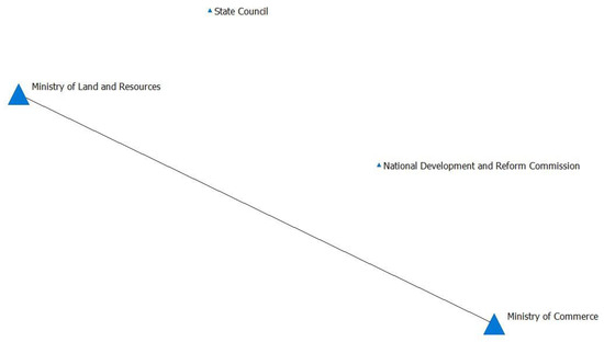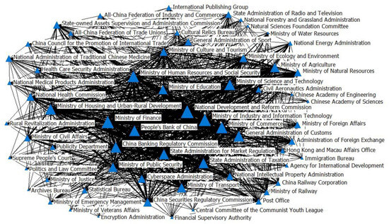 A social network analysis is a scientific method rooted in mathematics and graph theory, employed to investigate actors and their relationships through quantitative indicators [25,26,27]. A primary objective of this research is to elucidate policy change trends by revealing the departments issuing policies and exploring their relationships. After nearly two decades of evolution, a mature system of business environment policies has emerged, with numerous policies jointly formulated by pertinent central departments. This system forms the basis for analyzing collaboration among departments. In comparison to other methods, SNA proves more applicable due to its emphasis on departmental interactions, revealed through clear visualized mapping [28,29,30]. Issuers are listed completely in each of China’s policy documents. More than one issuer means the behavior of joint policy-issuing.