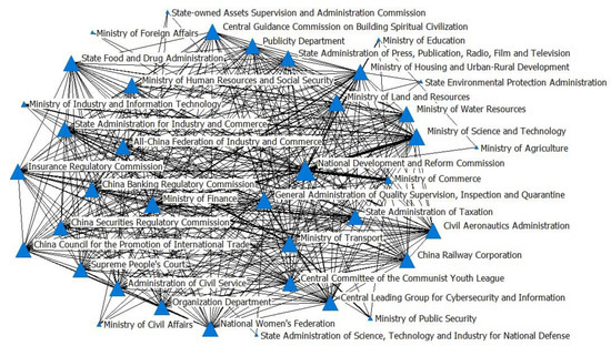 From 2011 to 2017, the number of governmental departments involved in business environment construction significantly increases. Each department produces more related policy documents, and inter-departmental collaboration becomes more frequent. Collaboration among ten departments, including the National Development and Reform Commission (degree = 49), the Ministry of Finance (degree = 33), the Ministry of Science and Technology (degree = 33), the Ministry of Transport (degree = 32), the Ministry of Land and Resources (degree = 32), the Ministry of Housing and Urban-Rural Development (degree = 31), the State Administration of Quality Supervision, Inspection and Quarantine (degree = 31), the General Administration for Industry and Commerce (degree = 29), and the Central Leading Group for Cybersecurity and Information (degree = 29), strengthens during this period. Among them, the National Development and Reform Commission, the Ministry of Finance, and the Ministry of Science and Technology constitute the core entities of the joint policy-issuing network. These three agencies guide the development of the overall business environment in China, highlighting its importance as a national strategy.