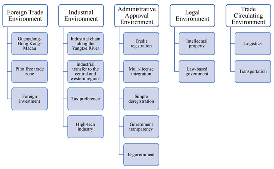 Fifteen topics were extracted in the preferred LDA model. To enhance result reporting, each topic is assigned a label reflecting its essence. Based on our field of knowledge, we categorized the topics into five groups: the (1) foreign trade environment, (2) industrial environment, (3) administrative approval environment, (4) legal environment, and (5) trade circulating environment. The following is an elaboration of these five categories of topics. Refer to Figure 8 for the topics assigned to each category and Table 2 for the corresponding terms of each topic. For corresponding policy text content in detail, see Appendix A.