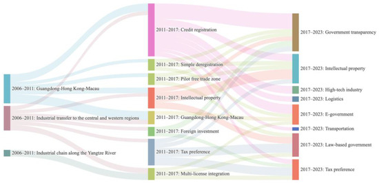 Moreover, a favorable business environment entails not only opening up to international trade but also fostering favorable conditions for industrial development. Regarding market opening-up, the Pearl River Delta continues to play a crucial role in facilitating the flow of international capital to domestic businesses. Meanwhile, for foreign enterprises, administrative approval procedures are streamlined to facilitate their operations. Another aspect of market opening-up involves implementing new business environment measures, such as streamlining trade procedures, reducing barriers, and enhancing efficiency in pilot free trade zones. These measures, if proven effective in pilot zones, will then be extended beyond pilot free trade zones to other provinces and cities [42]. Regarding the industrial environment after 2011, the central government’s measures shifted from solely strengthening cooperation among enterprises to offering special tax preferences for specific industries. Additionally, intellectual property protection became an essential part of the policy agenda in this period.