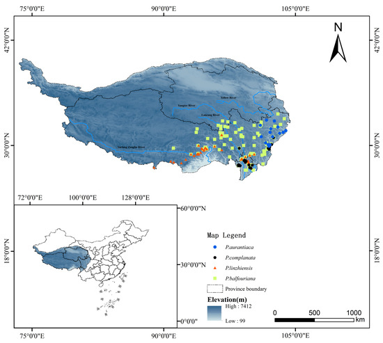 The boundary of the Tibetan Plateau was downloaded from the National Data Centre for the Tibetan Plateau (https://data.tpdc.ac.cn/home (visited on 23 May 2023)). The provincial boundary was acquired from the Resource and Environment Sciences Data Center (http://www.resdc.cn/ (visited on 23 April 2023)). The natural distribution point data of P. balfouriana, P. linzhiensis, P. complanata, and P. aurantiaca were received from the Vegetation Atlas of China (1:1,000,000), published by Geography Press, the Global Biodiversity Information Network (GBIF: https://www.gbif.org (visited on 5 June 2023)) and the Digital Herbarium of China (CVH: https://www.cvh.ac.cn (visited on 5 June 2023). Data without an exact location in the GBIF were first removed, and then latitude and longitude were acquired based on the geographic location of the species. Next, invalid data and duplicate data were removed using the ArcGIS SDM tool. We set up a 5 km × 5 km (2.5′) grid buffer and one geographic point was kept for every grid. The data of 178 effective distribution points of four endangered spruce species were finally obtained, as shown in Figure 1.