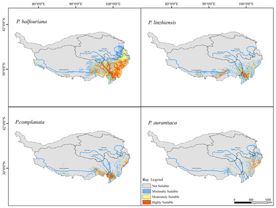 Based on the natural discontinuity classification method (Jenks) of ArcGIS software, we used the ASC data outputted by the MaxEnt model to divide the highly suitable habitat, moderately suitable habitat, lowly suitable habitat, and not suitable habitat for P. balfouriana, P. linzhiensis, P. complanata, and P. aurantiaca under different periods [45,51] (Table S2). We calculated the area of the different divided areas by ArcGIS 10.8 software according to the approach raised by Zayneb Soilhi et al. [52].