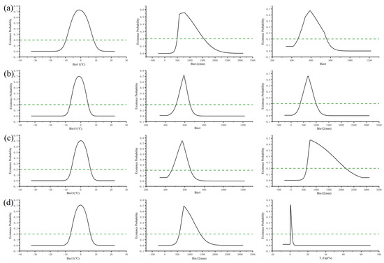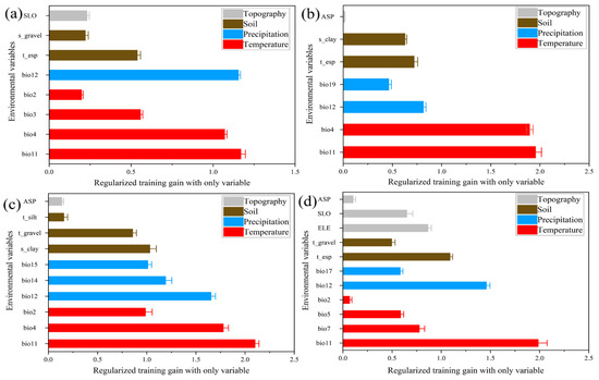The importance value of the variables obtained by the Jackknife method was applied to quantitatively analyze the influence of environmental factors on the geographical distribution of forest types and to screen out the dominant environmental factors [53]. The Jackknife test in MaxEnt sequentially employs and rules out a specific variable to build a new model [54,55]. Higher values of regularized training gain for “including only this variable” demonstrate higher predictability accuracy and are more important for predicting species distribution. In this study, the dominant environmental variables that influence species distribution were used to evaluate using the Jackknife method and contribution rate and analyze the importance of environmental variables. Generally, when the existence probability value was >0.2 in response curves, the corresponding ecological variable range values were suitable for plant growth.