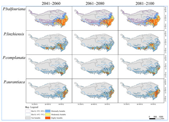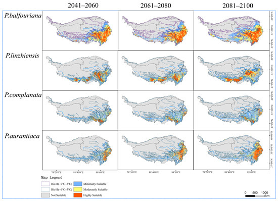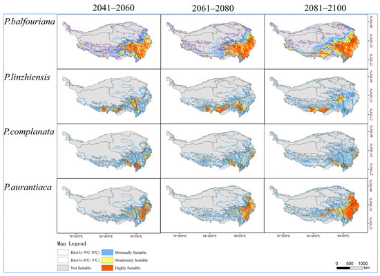 Against the backdrop of global warming, some research about spruce on the Tibetan Plateau has shown that the suitable habitat for spruce is in a trend of increase [58,64]. Under different future climate pathways in 2041–2100, the suitable area for four endangered spruce species is expected to be distributed in the southern and southeastern Tibetan Plateau, and the size of suitable habitats for endangered spruce will increase to different extents. The suitable habitat area of four endangered spruce species was the largest under the 2081–2100 SSP585 climate pathway, accounting for 39.86%, 17.59%, 20.37%, and 26.46% of the Tibetan Plateau, respectively. In some research on predicting suitable habitats for spruce on the Tibetan Plateau, it was found that highly suitable areas for spruce were mainly situated in the eastern, southern, and southeastern Tibetan Plateau [58,64]. In the present study, the highly suitable habitat of P. balfouriana is mainly situated in the southeastern area of the Tibetan Plateau, and P. complanata is scattered, located at the eastern and southern Tibetan Plateau. The highly suitable habitat of P. linzhiensis and P. aurantiaca is mainly situated in the southern and eastern regions of the Tibetan Plateau. With the suitable growth range of the mean temperature of the coldest quarter temperature increases over time on the Tibetan Plateau, over 88.36% of the total suitable area of endangered spruce is projected to fall within the suitable growth range. Further, this indicates that the expansion of the suitable growth range of the mean temperature of the coldest quarter leads to an increase in the total area of suitable habitat [36,65,66].