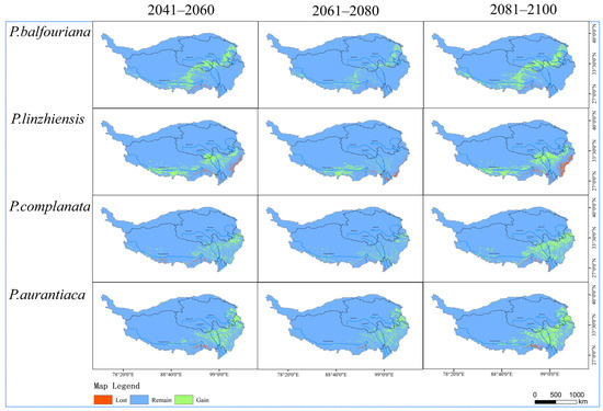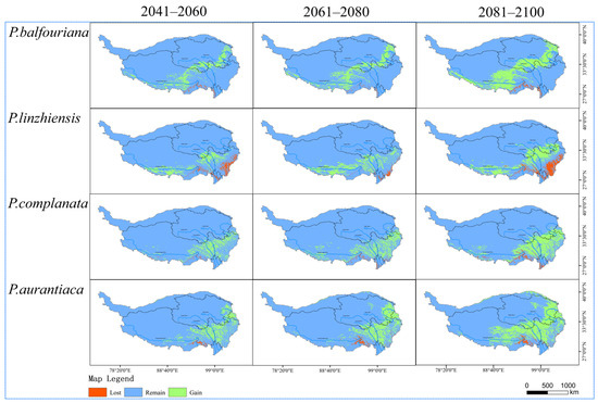 Based on the natural discontinuity classification method (Jenks) of ArcGIS software, we obtained suitable and non-suitable habitats for four endangered spruce species. Changes in spatial patterns in the suitable areas of P. balfouriana, P. linzhiensis, P. complanata, and P. aurantiaca were investigated under different future climate scenarios by using the ArcGIS (10.8) grid processing tool [45,51]. Three categories of alterations in suitable habitats were defined, namely, area of gain, area of loss, and remaining area. The future changes in suitable habitats were calculated based on current conditions. Under different future climate pathways, the spatial pattern of a suitable area changes as follows: changes from a suitable area to an unsuitable area were considered to be a loss of area, changes from an unsuitable area to a suitable area were considered to be a gain area, and the other changes were considered to be remaining area.
