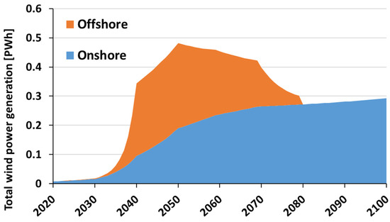 Meanwhile, no actual measured values for offshore wind power were found [39], but predicted values based on previous research were available. In the current study, we applied estimates of the average installed capacity of offshore wind for each year until 2100. The average installed capacity in Akita Prefecture in the northern region of Japan, which was selected as a region to promote offshore wind power, was 4.2 MW [47]. Therefore, we assumed a linear increase based on 4.2 MW in 2021, 12 MW in 2030, and 15 MW in 2050 [39,47]. The average installed capacity () per unit for onshore and offshore wind power will remain constant after 2050 due to the maturity of the wind power industry. In the LED scenario, the growth rate of total wind power generation is projected to stagnate globally after 2050 [36]. This study examines the case in which the wind power industry matures, and the size of wind turbines ceases to increase. Nevertheless, there is a possibility that the average installed capacity will continue to grow after 2050 (Appendix B). Considering the evolution and technological innovation of this industry, wind power generation will possibly become larger even after 2050, and thus, attention must be given to the future of the wind power industry.