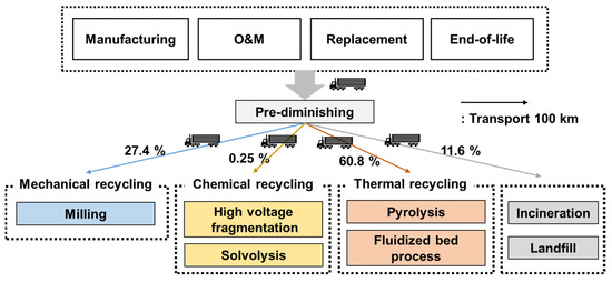 GFRP/CFRP waste treatment process flow. After pre-diminishing, waste is transported 100 km by lorry and assigned to multiple processing steps. The percentage of each treatment process was based on Japan’s plastic waste treatment method [48]. Reproduced with permission from Japan Plastic Recycling and Reuse Association, Production, Disposal, Recycling, Treatment and Disposal of Plastic Products in Japan; published online in 2023 [48].
