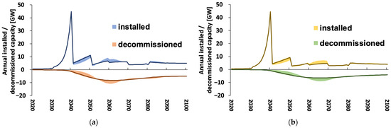 (a) Average lifetime () = 20. (b) Average lifetime () = 25. Estimation results for installed and decommissioned capacities from 2020 to 2100 in the base case. Decommissioned capacity exhibits the increase as a negative value. The solid line is C2 ( = 2.0). The coloured area indicates the amplitude of variation between C1 ( = 1.73) and C3 ( = 4.07).