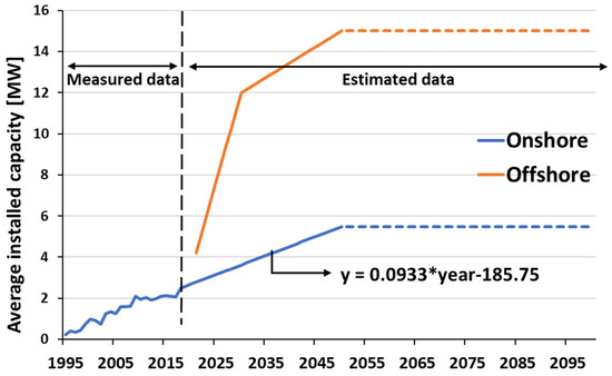For the average installed capacity of onshore wind power, the measured values from 1995 to 2017 were used, but linear projections of the measured values were used from 2018 to 2050 (Section 2.3) due to technological innovations that increased the size of wind turbines and blades [37]. The measured value was also confirmed to increase linearly from 1995 to 2017, and even after, the average installed capacity per unit has been confirmed to increase every year from actual implementation cases in Denmark [39].