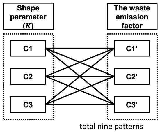 Figure 4 shows an image of wind blade waste generation. When the total weight of the wind blade itself was taken as 100%, the amount of waste emitted during the four life cycle stages (Figure 1) defined in this study was expressed as a percentage in accordance with previous research [6]. It was set as a waste emission factor [%] [(waste weight at each life cycle/blade body weight) × 100] (Table 2). At each life cycle stage, waste is discharged in accordance with the specified discharge year (Table 2). Furthermore, at the end-of-life stage, 100% of the blade itself will be discharged as waste [6]. Three cases were set for the manufacturing stage and service stage: Case 1′, Case 2′ (base), and Case 3′ [6]. Values of parameters used in Case 2′ were close to median in various scenarios in previous studies [6]; therefore, it was set as the “basic case” in this study. Hereafter, Case 1′ will be referred to as C1′, Case 2′ (base) as C2′, and Case 3′ as C3′. When calculating the amount of wind blade waste, three cases (C1, C2, and C3) were set for the shape parameter () used for the Weibull distribution (lifetime) (Section 2.3.1). We calculated nine different combinations for each.