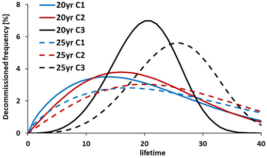 Meanwhile, the maximum value of decommissioned capacity will be 8.3 GW in 2062 (Figure 6a) and 6.5 GW in 2065 (Figure 6b) when is the base case (C2) and = 20 and 25, respectively. When the shape parameter () of the Weibull distribution is C1 and C3, the difference between the maximum and minimum decommissioned capacities is 2.6 and 2.8 GW when = 20 and 25, respectively (Figure 6). Furthermore, decommissioned capacity is estimated to increase from around 2031 to 2040 for = 20 and 25, because facilities that will be introduced in large numbers between 2060 and 2065 will have reached their respective lifetime and be decommissioned.