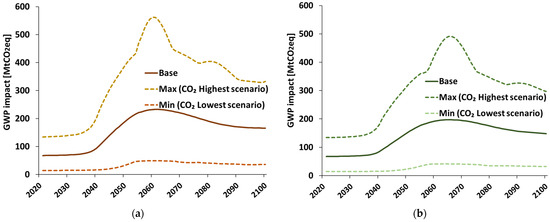 We calculated the annual installed and decommissioned capacities of wind power generation to calculate the amount of blade waste up to the year 2100. Figure 6 shows annual installed and decommissioned capacities when the average lifetime () is 20 years (Figure 6a) and 25 years (Figure 6b) based on the LED scenario [31] (Section 2.2), which is the energy scenario used in the current study.