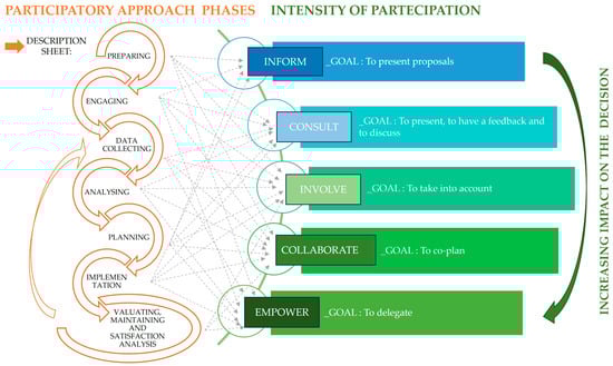 However, it is important to consider how the intensity of participation may also vary in relation to the specific planning phase (preparing, engaging, data collecting, analysing, planning, implementation, evaluating and maintaining, and satisfaction analysis). In particular, “during each and all phases of research, decisions must be made about which tools and methods will produce the desired level of participation” [45]. Some authors state that if participation takes place in the very early stages of the design process, participants will have the opportunity to influence decisions more, thus authorities and technicians will be able to make effective use of local knowledge and skills and social learning will be stimulated [46].