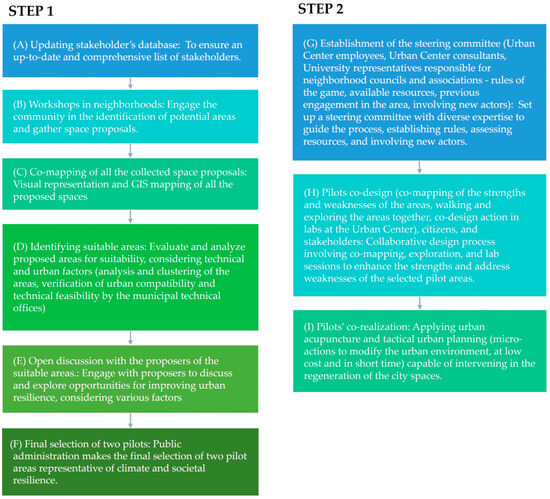 The second step consisted of the co-design process. Following the verification of the availability of resources to implement the two pilot projects, the Urban Center reactivated the steering committee (composed of members from the Urban Center, the university, project-appointed consultants, and some gatekeepers), focusing activities on co-design workshops for the two pilot areas (mapping and design labs). Figure 3 shows the two steps of participatory process developed in Brescia.