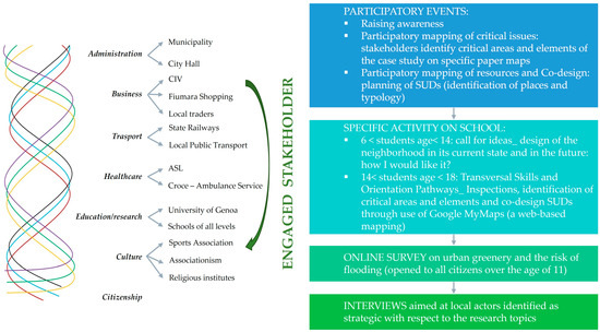 - The actors of the other territorial functions are engaged according to a methodology that has been set up specifically for the project. Businesses and local communities are part of a public–private working group (4P participation) that meets in thematic focus groups through which they raise awareness of relevant issues and activate co-mapping and co-design spaces; schools of all levels—to confirm the intergenerationally of the methodology—are involved through customised activities according to school grade. As far as the schools are concerned, in compliance with the regulations in force, primary, and secondary school students carry out the activities during school hours directly in the classroom. Students from 6 years of age were involved through a call for ideas on the perception of urban greenery in the Sampierdarena district. Secondary school students located in the study area, on the other hand, take advantage of the University’s activation of specific PTCOs (transversal skills and orientation pathways, which become a tool of deep learning for the students and a strong engagement for the 14–19-year-old target group regarding the research world). During the first activities they will be involved in mapping through the parallel use of a paper map and the Google MyMaps platform, where they then report all critical issues, both from the point of view of urban greenery and the risk of flooding. The second activity, on the other hand, focuses on the design and planning of sustainable urban drainage systems (SUDs). Furthermore, an online survey opened to all inhabitant (over the age of 11), has been launched for three months and specific interviews were conducted with strategic stakeholders with respect to the research topics. A detailed description of the Genoa participatory process is provided in [52].