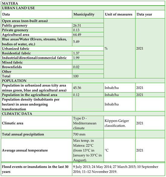 Matera’s description sheet describing urban land use data and climatic data.