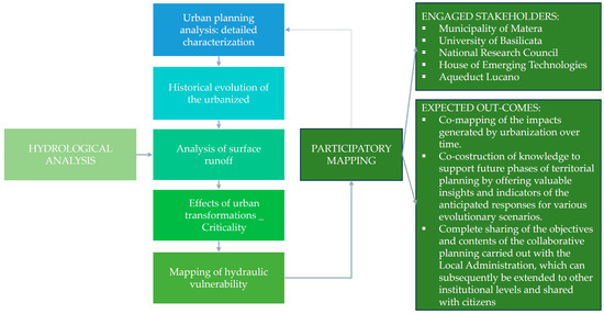 Furthermore, the Matera municipal administration, in collaboration with the House of Emerging Technologies (the scientific partners of the project are the University of Basilicata, the Polytechnic of Bari, and the National Research Council) has initiated the creation of an Urban digital twin of the city to support intervention policies in terms of its various assets. Within this interdisciplinary research group, the University of Calabria-University of Basilicata focuses on the mapping and monitoring of surface runoff and the risk of urban flooding and will apply the use of this technology to support the decision-making process in the case study of the Ex-Pastificio Padula-Barilla [53]. Figure 7 illustrates the framework of the participatory process in Matera including the list of the main activities, analysed elements, engaged stakeholders, and expected outcomes.